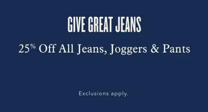 Don't wait! Shop in store and get 25% off all jeans, joggers & pants.